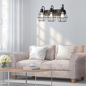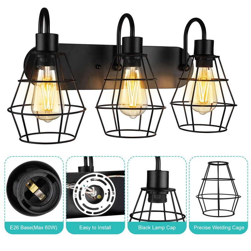 ¡¾Industrial Style & Metal Cage Design¡¿: 3-Light Bathroom Metal Vanity Lighting Fixture with black vintage cage look, adding a rustic farmhouse element to your indoor living aesthetic. The cage design can protect the bulbs and maximize its lighting effects at the same time.Good choices for home decoration!