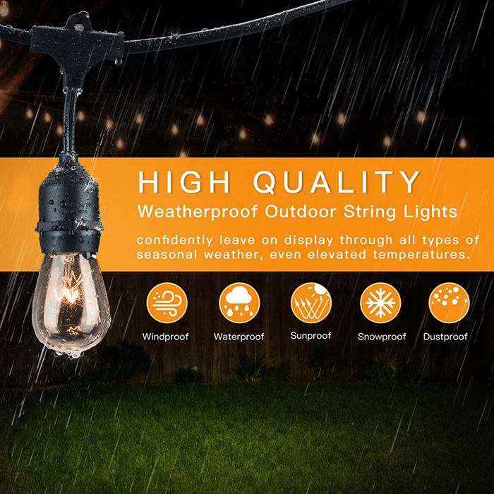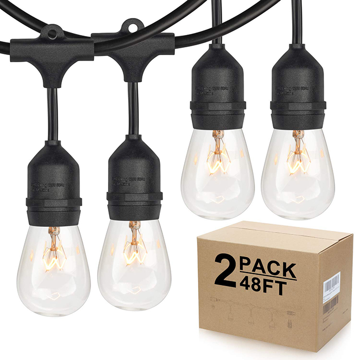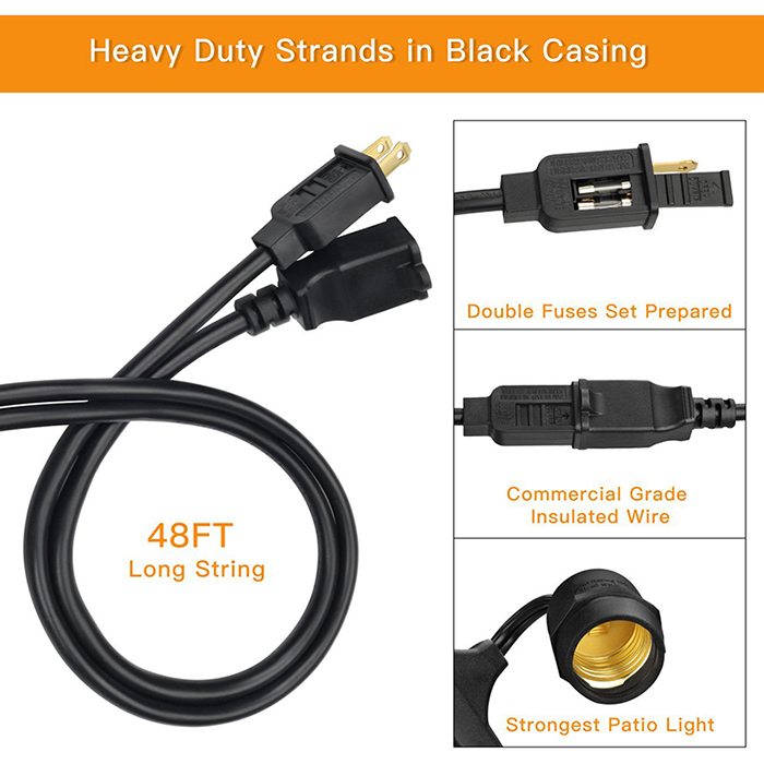 STRONGEST COMMERCIAL QUALITY AT A RESIDENTIAL PRICE ¨C 2-Pack 48 feet black rubber weatherproof cord contains durable wire strung through 15 WEATHERPROOF light sockets, set about 3 feet apart. End-to-end connections, feel free to customize your arrangements. Heavy duty rubber construction throughout the molded sockets & integrated hanging loops. Compare to other hanging lights and YOU will definitely see how PRO ours are in quality.