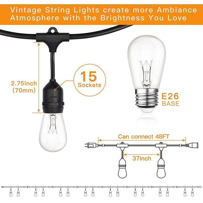 EASY INSTALLATION - Use cup hooks, guide wires, or zip ties with the built-in loops to hang perfectly. 15 Clear 11-watt S14 incandescent bulbs are included on a 48 feet long heavy duty string. (1 free extra bulbs in the package as well for replacements. Connect up to 5 strings to enlighten any event and create a festive flair. Enjoy years of illumination at any venue indoors or outdoors with just a few minutes of installation.