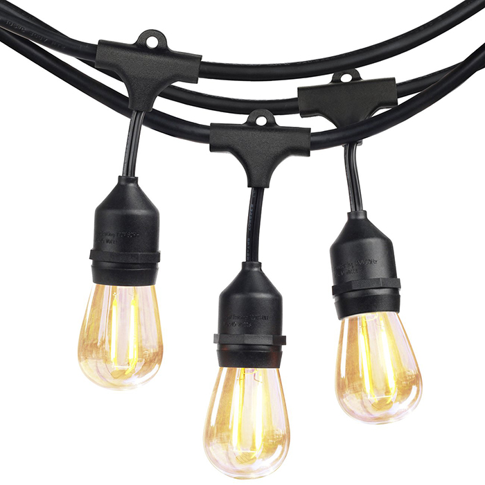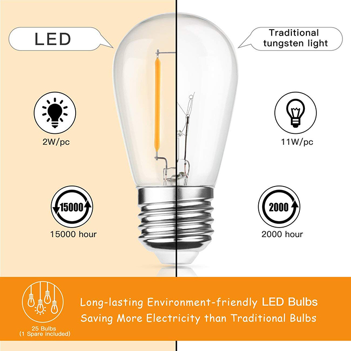 EASY INSTALLATION - Use cup hooks, guide wires, or zip ties with the built-in loops to hang perfectly. 24 Clear 2-watt S14 led bulbs are included on each 48 feet long heavy duty string(1 free extra bulbs in the package as well for replacements). Connect up to 15 strings to enlighten any event and create a festive flair. Enjoy years of illumination at any venue indoors or outdoors with just a few minutes of installation.