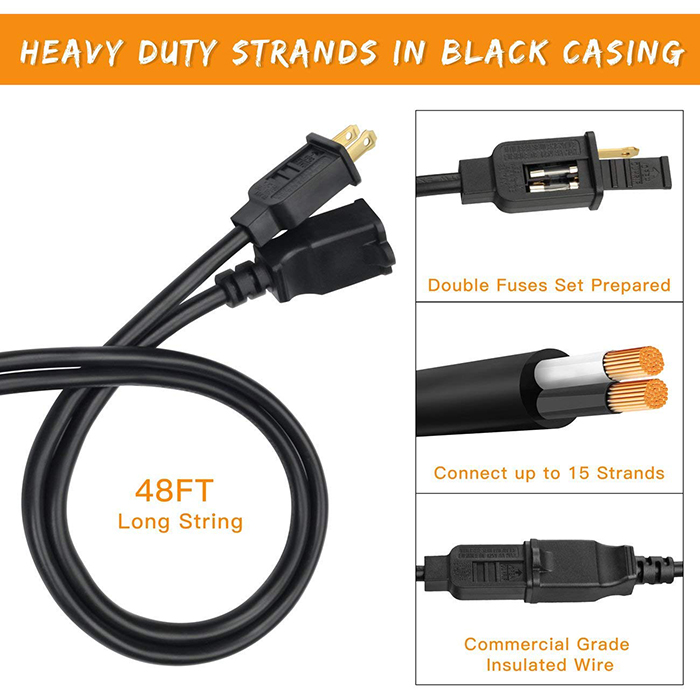 PRO COMMERCIAL GRADE AT A RESIDENTIAL PRICE - 2 PACK long strands, 96ft in total. Each 48 feet black rubber weatherproof cord contains durable wire strung through 24 WEATHERPROOF light sockets, set about 2 feet apart. End-to-end connections, feel free to customize your arrangements. Heavy duty rubber construction throughout the molded sockets & integrated hanging loops. Compare to other hanging lights and see the difference in quality.