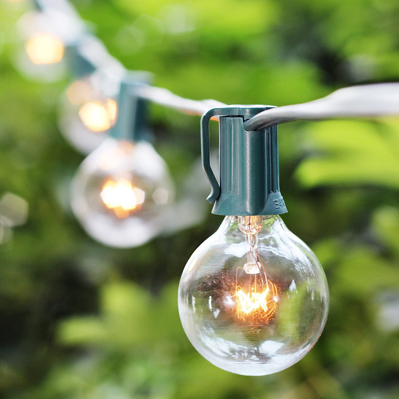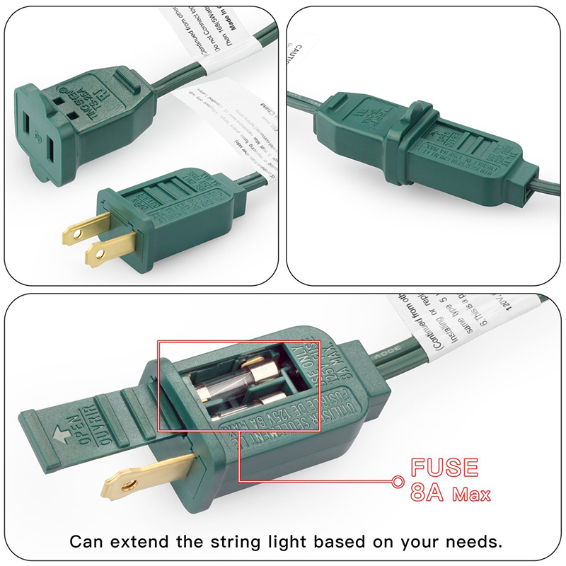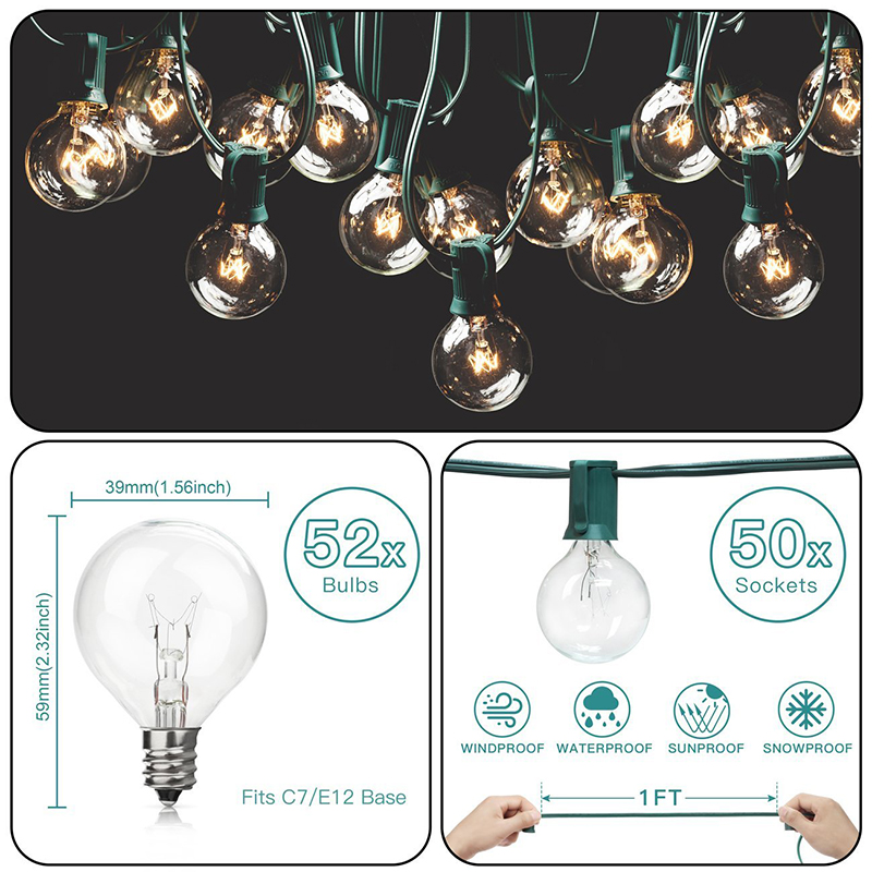 50 Feet green rubber weatherproof cord contains 50 light sockets, set about 1-foot apart. End-to-end connections, feel free to customize your arrangements.