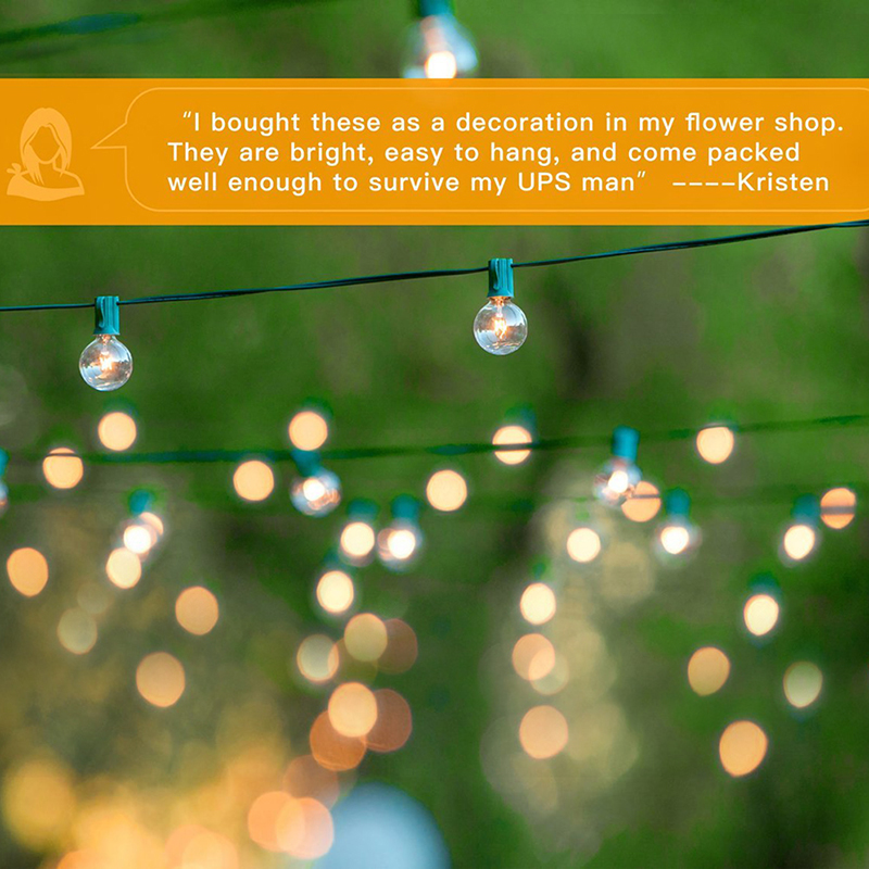 52 Bulbs included (We put 2 free extra bulbs in the package as well for replacements. We are devoted to improve your purchasing experience with us). Clear 5-watt G40 incandescent bulbs on a 50 feet long string.