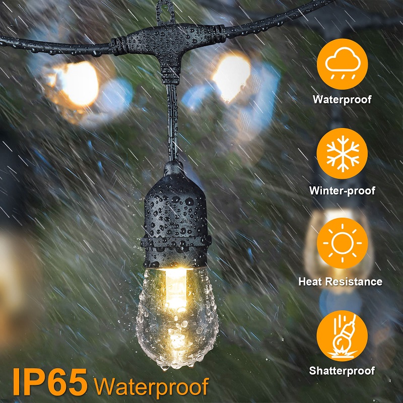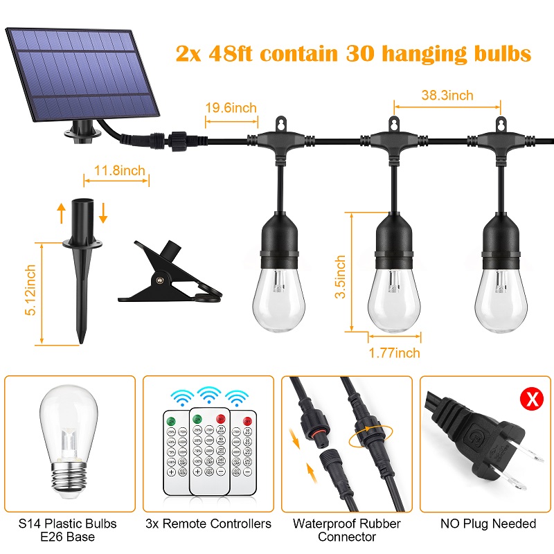 Our solar outdoor string lights you are browsing now are real dimmable string lights solar powered, no need to buy the dimmer: Just use the included remote controllers to choose solar lights color temperature (2700K/4000K/5000K) & light brightness(25%/50%/75%/100%), all in one solar patio string lights. The package contains 2-pack Each 48ft solar string lights outdoor; 2x solar panels with 2 stakes & 2 clips; 3x remote controllers; 2x USB charing cables & user manual. Each strand with 15 waterproof & shatterproof LED EDISON hanging bulbs; 5x Extra bulbs; These bulbs are S14 shaped, E26 standard base, 3.19feet bulb spacing;