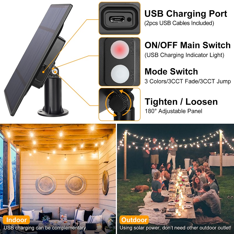 ENERGY SAVING, LESS ELECTRICITY BILLSThese solar patio lights use solar energy that helps you save money on electricity. Less Electricity Bills for Your Home. The 4400mAh large capacity solar panel can last 8-10 hours i.e. 8 hours of direct sunlight. If there is not indirect sunlight, 6 hours charging via USB port is also applicable. The light sensor panel makes the string lights solar automatically turn on at night and off at dawn. Note: 1£ºPlease Firstly press the main power switch in order to use these solar patio string lights outdoor. 2£ºThe solar panel light is red at the right side when charging, which will turn blue when fully charged. |