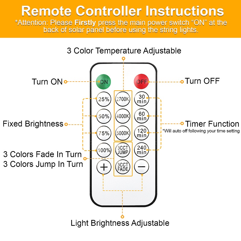 The Latest 3-Colors in 1 Dimmable Solar String Lights Outdoor with Remotes : 2700K Warm White/4000K Neutral White/5000K Daylight White for choosing, or you can select color temperature by pressing the color mode switch on the back of the solar panel. 4 Level Timer Function: 30min/60min/120min/240min mode, will auto-off following your setting so that there's no additional action necessary after your initial setup.