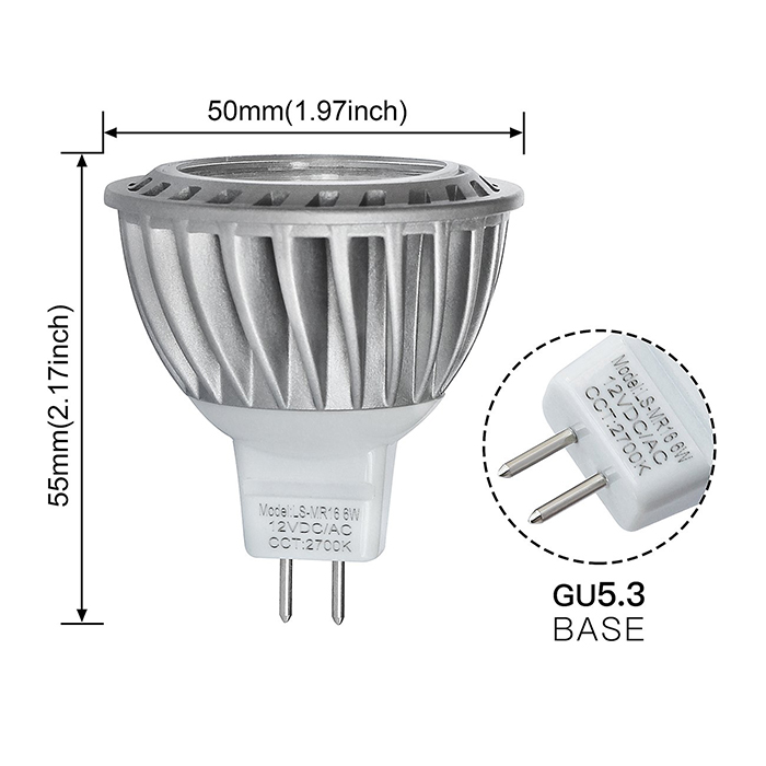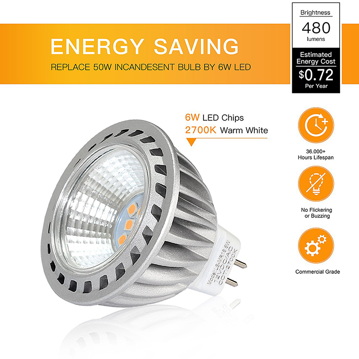 SGL 6-pack 6W MR16 GU5.3 LED Bulbs, 100% Aluminum Reflector, 50W Equivalent Replacement, 500lm, Warm White,2700K, 40 Degree Beam Angle, CRI>85, Standard Size, Recessed Lighting, Track Lighting, Spotlight, LED Light Bulbs